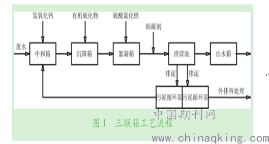 三聯箱技術作為國內的脫硫廢水處理應用最多的一種工藝技術,包含“絮凝—沉淀—中和”,具體工藝流程如圖1所示。脫硫廢水經加堿(氫氧化鈉或氫氧化鈣)中和后,再加入有機硫、硫酸氯化鐵等絮凝劑以及助凝劑等藥品將脫硫廢水中的懸浮物及重金屬沉淀去除。沉淀的污泥經脫水處理后運至渣場進行綜合處理,處理出水則經pH調節后進行排放。三聯箱技術是國內普遍采用的脫硫廢水處理工藝,廢水含固量大成為制約該工藝發展的重要因素,不僅導致設備故障率高,運行穩定性差,而且需要添加大量藥劑,增加運行成本。